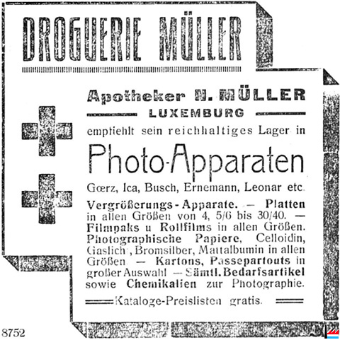 | <=1917 | ![]() Drogerie Muller, Luxemburg (LW: 19.6.1917) Photo-Apparate: Goerz, Ica, Busch, Ernemann, Leonar, etc. |
