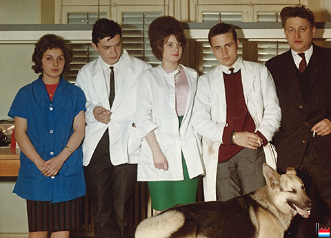Mai 1962 - Pol Aschman avec ses collaborateurs et collaboratrices Amélie Binda, Lothar Guth, Marcelle Weyrich et Jürgen Pietzner. - Studio et laboratoire photographique sis au n° 7 de la rue Michel Welter à Luxembourg.