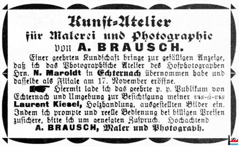 | 17.11.1895 | ![]() A. Brausch, Echternach, Maler und Photograph (OMZ: 12.11.1895) Übernahme des Photographischen Ateliers des Hofphotographen N. Maroldt in Echternach |