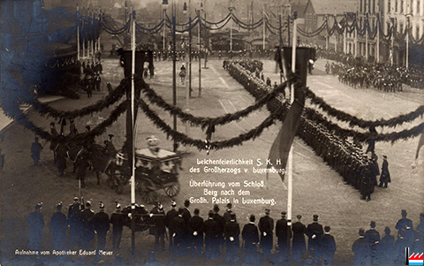 | 2.1912 | ![]() Leichenfeierlichkeit S.K.H. des Großherzogs Wilhelm IV. von Luxemburg - Überführung vom Schloß Berg nach dem Großherzoglichen Palais in Luxemburg (Aufnahme vom Apotheker Eduard Meyer; Collection: Laurent Weber) |