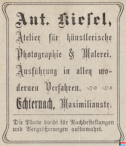 | ? - 1898, 1906 - ? | ![]() Atelier für künstlerische Photographie & Malerei Ant. Kiesel, Echternach, Maximilianstraße |