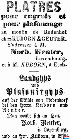 | 1873 | Plâtres pour engrais et pour plafonnage Landgyps und Plafoniergyps Kuborn & Reuter Mühle von Rodenhof Norbert Reuter, Luxembourg Kuborn, Esch |