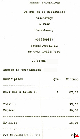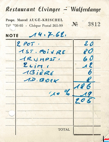 | 7.1956 | ![]() Hôtel du Commerce, Beaufort - facture du 16.7.1956 (Collection industrie.lu) Propr. Eug. Lenert - Schuler, tél: 17 1 chambre: 110 fr 1 chambre: 100 fr 4 ?: 200 fr 4 petits-déjeuners: 80 fr 2 bières: 12 fr 2 limonades: 10 fr 10% |