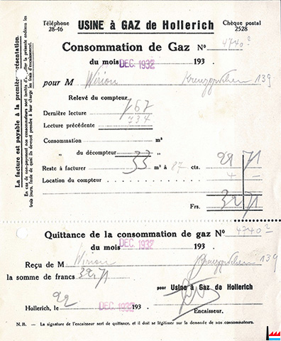 ![]() Usine à gaz, Hollerich - Facture décembre 1932 pour M. Wirion, Kreuzgründchen, Luxembourg (Collection: industrie.lu) Prix gaz: 0,87 fr / m³ Location du compteur: 4 fr |