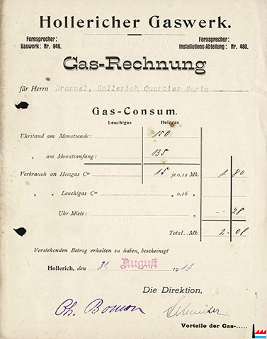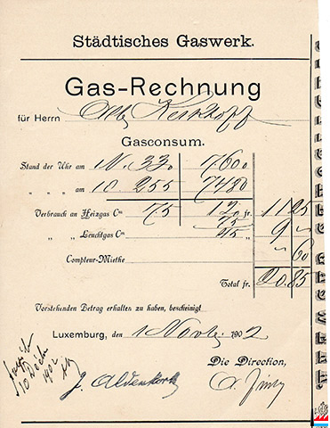 ![]() Hollericher Gaswerk, Luxemburg - Gas-Rechnung - August 1913 für Herrn Brassel, Hollerich, Quartier Maria (Collection: industrie.lu) Heizgas: 0,12 Mark / Cm Leuchtgas: 0,16 Mark / Cm Uhr-Miete: 0,28 Mark |