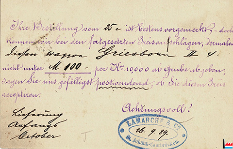 Ihre Bestellung vom 25 c ist bestens vorgemerkt, doch können wir bei den festgesetzten Preisaufschlägen, dermalen diesen Waggon Griesborn II 4 nicht unter 100 Mark per 10.000 Kilos ab Grube abgeben; sagen Sie uns gefälligst postwendend, ob Sie diesen Preis acceptieren. Lieferung Anfang October. |