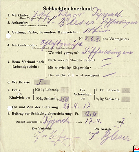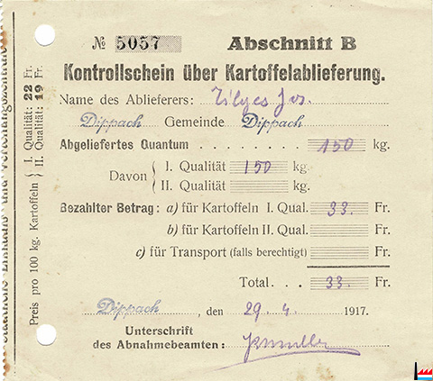 | 29.4.1917 | ![]() Kontrollschein über Kartoffelablieferung (Collection: Familie Tilges) Name des Ablieferers: Jos. Tilges, Dippach Abgeliefertes Quantum: 150 kg Bezahlter Betrag für Kartoffeln I. Qualität: 33 Fr. Preis pro 100 kg Kartoffeln I. Qualität: 22 Fr. |