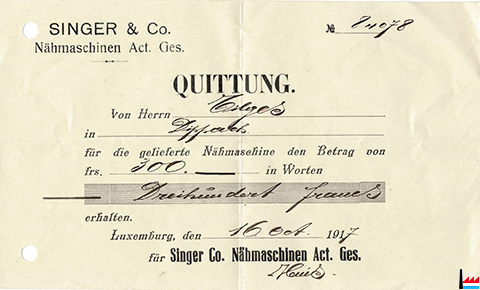 | 16.10.1917 | ![]() Singer & Co Nähmaschinen A.G. - Quittung (Collection: Familie Tilges) von Herrn Tilges in Dippach für die gelieferte Nähmaschine den Betrag von 300.- erhalten |