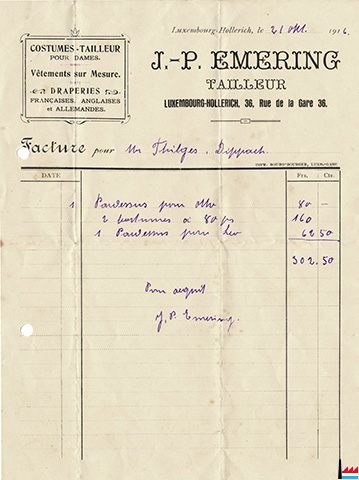 1 Pardessus pour Otto: 80 fr Facture pour M. Tilges, Dippach (Collection: Familie Tilges) |