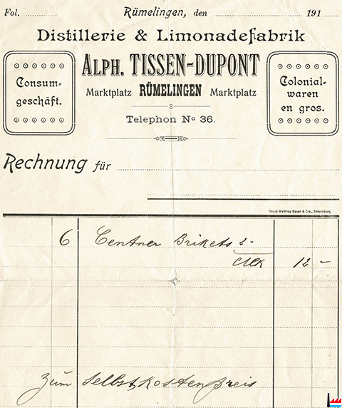 Distillerie & Limonadefabrik Tissen - Dupont Alphonse, Marktplatz, Rümelingen - Rechnung 190x Collection: industrie.lu) Consumgeschäft - Colonialwaren en gros - Tél: 36 6 Zentner Briketts Mk 12.- zum Selbstkostenpreis |