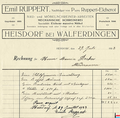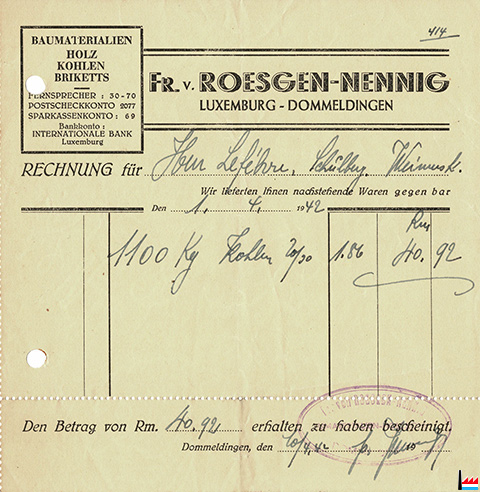 | 1942 | ![]() Facture - Rechnung Fr. von Roesgen-Nennig, Dommeldingen - 1942 (Collection: Collection: industrie.lu) Baumaterialien - Holz - Kohlen - Briketts |