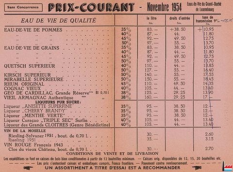 | 11.1954 | ![]() Distillerie Moderne Charles Meder, Esch/Alzette - Prix courant 11.1954 (Collection: industrie.lu) Droits d'entrée Taxe de transmission 9% /12% |