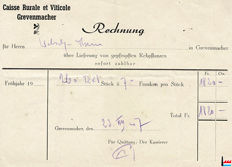 | 1947 | ![]() Caisse Rurale et Viticole, Grevenmacher - 1947 (Collection: industrie.lu) Rechnung: 260 gepfropfte Rebpflanzen Rxl à 7 Franken |