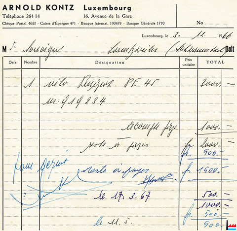 | <=1966 | ![]() Arnold Kontz, Luxembourg, 16 avenue de la Gare (Collection: industrie.lu) Prix: 1 vélo Peugeot PE45: 3000 fr |