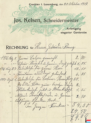 | 10.1917 | ![]() Kelsen Jos., Cruchten, Schneidermeister - Maître-tailleur - 1917 - Rechnung (Collection: industrie.lu) |