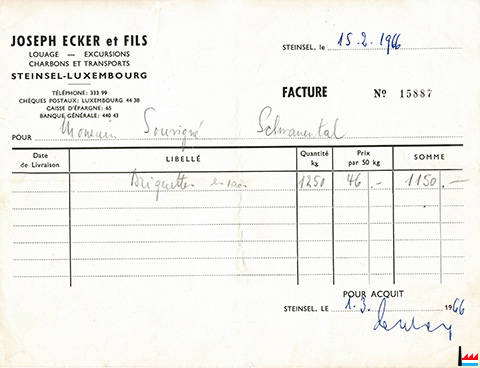 ![]() Joseph Ecker et fils, Steinsel - facture du 15.2.1966 à M. Souvigné, Schwanental Louage - Excusions - Charbons et Transports Tél: 33399 |