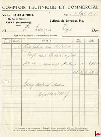 | <=1941 | ![]() Comptoir technique et commercial Laux-Linden Victor, Kayl - facture de 1941 (Collection: industrie.lu) Autofahrt 114 km, verrechnet 110 km je 2,5 Fr = 275 Fr oder 27,50 RM |