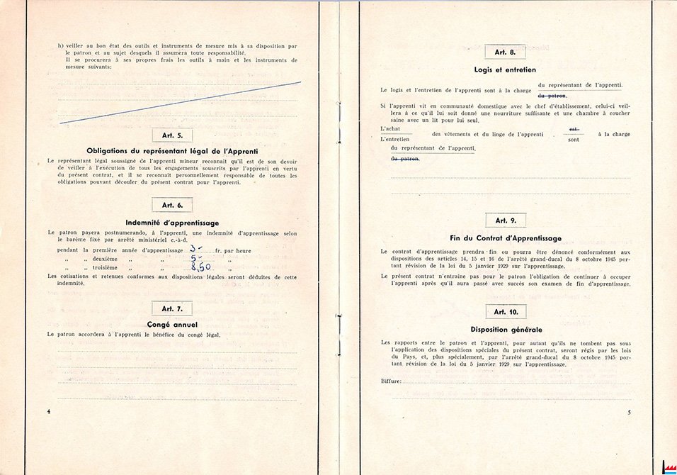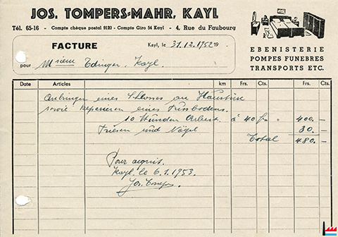 | <=1952 | ![]() Tompers - Mahr Jos., Kayl, Ebenisterie - pompes funèbres - transports - facture de 1952 (Collection: industrie.lu) 1 Arbeitsstunde - 1 heure de travail: 40 fr = ~1 € |