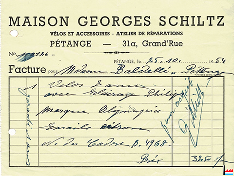 | 1954 | ![]() Schiltz Georges, Pétange, 31a Grand'Rue - facture du 25.10.1954 (Collection industrie.lu) Vélos et accessoires - Atelier de réparation Vélo Dame Olympia - Prix 3.250 fr |