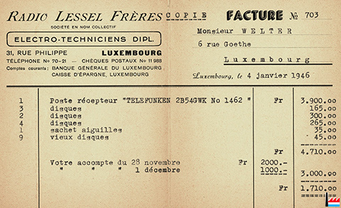 | 1.1946 | ![]() Lessel frères, Luxembourg, 31 rue Philippe - facture du 4.1.1946 pour radio Telefunken 2B54GWK No 1462, Prix: 3.900 fr (Collection: industrie.lu) |