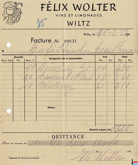 | 15.2.1952 | ![]() Félix Wolter, Wiltz - Vins et limonades - facture du 15.2.1952 (Collection: industrie.lu) pour: Café Schinker, Consthum |