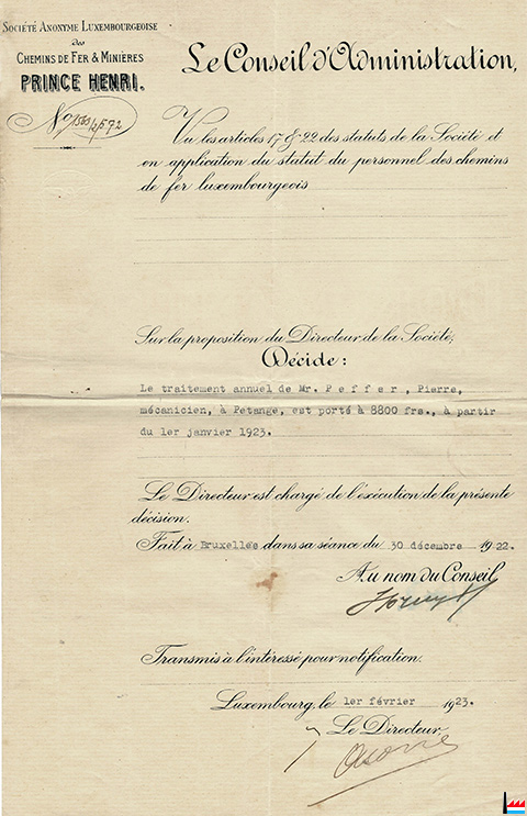 ![]() Société anonyme luxembourgeoise des chemins de fer et minières Prince Henri à Luxembourg - 1.2.1923 (Collection: industrie.lu) Peffer Pierre, mécancien à Pétange, traitement annuel: 8.800 fr |