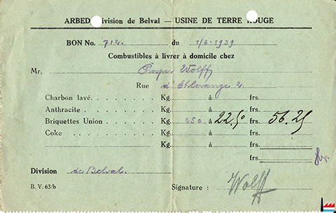 | 1939 | ![]() ARBED - Division de Belval - Usine de Terre Rouge - Bon du 1.6.1939 - Combustibles à livrer à domicile chez Prosper Wolff, 2 rue d'Ehlerange - 2,5 kg de Briquettes Union à 22,50 fr/kg (Collection: industrie.lu) Charbon lavé - Anthracite - Briquettes Union - Coke |