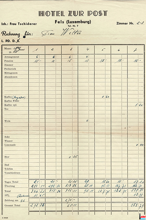 | 5/6.1944 | ![]() Hotel Zur Post, Fels (Luxemburg), Inh. Frau Tschiderer, Tel: 7 - Rechnung - facture 3.6.1944 für Frau Welter (Collection: industrie.lu) L. PD. D. S. |