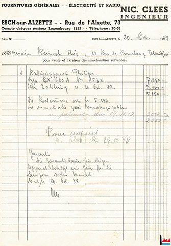 | 10.1948 | ![]() Fournitures générales - électricité et radio Nic. Clees, ingénieur, Esch/Alzette - facture du 20.10.1948 à Théo Reinert, Tétange, 22 rue de Rumelange: 1 Radioapparat Philips BX680A N° 1533, Prix: 7.250 fr (Collection: industrie.lu) |