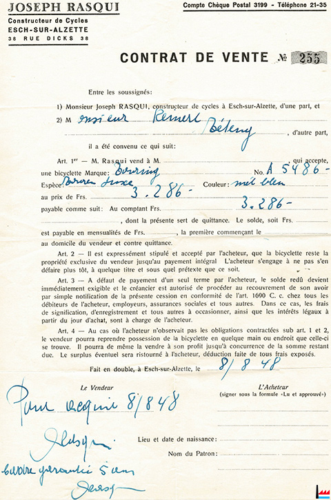 | 1948 | ![]() Joseph Rasqui, constructeur de cycles, Esch/Alzette - contrat de vente pour une bicyclette marque Touring Prix: 3286 fr à (Théo) Reinert, Tétange, (22 rue de Rumelange) (Collection: industrie.lu) |