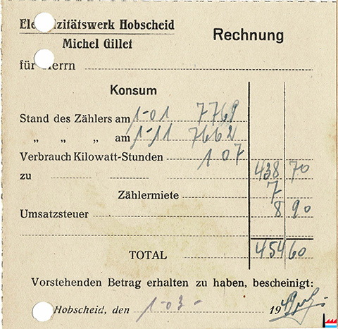 | 1.1949 | ![]() Elektrizitätswerk Hobscheid, Michel Gillet - Rechnung (Collection: industrie.lu) Verbrauch: 107 kwh: 438,70 fr Zählermiete: 7 fr Umsatzsteuer: 8,90 fr |