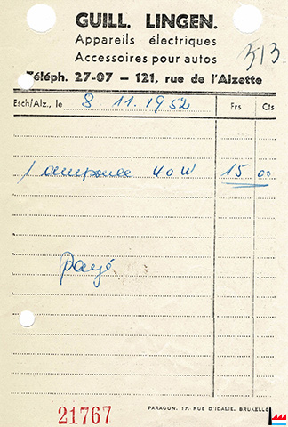 | 1952 | ![]() Lingen Guill., Esch/Alzette, 121 rue de l'Alzette - 8.11.1952 (Collection: industrie.lu) 1 ampoule 40 W: 15 fr |