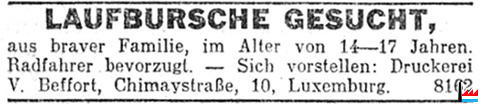| 1928 | ![]() St. Paulus-Druckerei A.G., Luxemburg-Bahnhof - Verlag des Luxemburger Wort - Rechnung 1928 an Beffort, Chimaystrasse, Luxemburg (Collection: industrie.lu) ![]() Anzeige N° 8162 im LW - Prix: 36 fr: Laufbursche gesucht - Druckerei V. Beffort, 10 Chimaystrasse, Luxemburg (LW: 28.4.1928) |