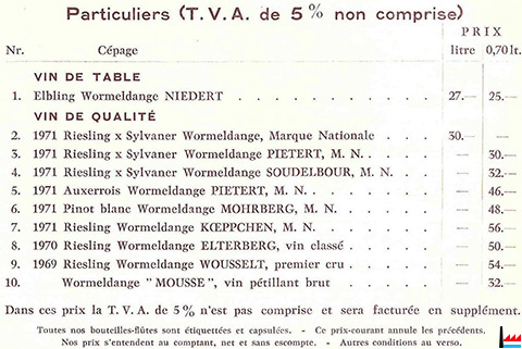 | 1972 | ![]() Caves coopératives des vignerons de Wormeldange - Foire internationale de Luxembourg 1972 - Prix-courant - Particuliers - Collection: Ph. Aschman |