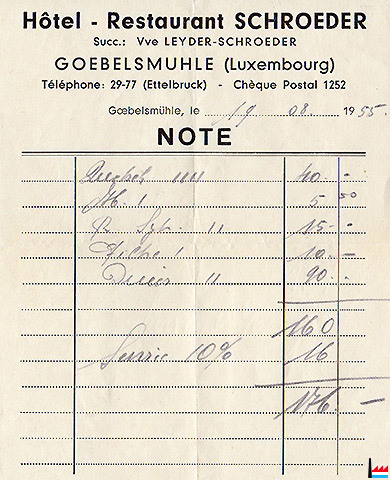 | 19.8.1955 | ![]() Hôtel Restaurant Schroeder, Goebelsmühle (Collection: industrie.lu) Prop. G. Leyder - Schmit |