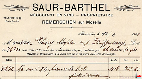 | 1909 | ![]() Saur - Barthel, Remerschen - Négociant en vins - Propriétaire - 1909 (Collection: industrie.lu) 1272 litres de vins (1908) à 24 francs la botte (fût de 43 ? litres) = 763, 20 francs |