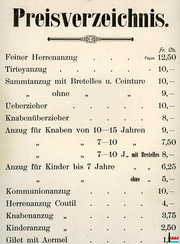 | ? | ![]() Preisverzeichnis von Pierre Lesch, Consdorf (Collection: industrie.lu) Feiner Herrenanzug, Tirteyanzug, Samtanzug mit Bretelles und Ceinture, Überzieher, Knabenüberzieher, Anzug, Kommunionanzug, Herrenanzug Coutil, Knabenanzug, Kinderanzug, Gilet mit Ärmel |