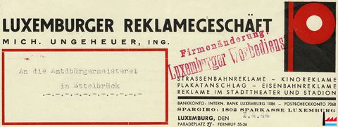 | <=4.1944 | ![]() Luxemburger Reklamegeschäft Mich. Ungeheuer, Ing., Luxemburg, Paradeplatz 13, Tél: 5526 (Collection: industrie.lu) Strassenbahnreklame, Kinoreklame, Plakatanschlag, Eisenbahnreklame, Reklame im Stadttheater und Stadion Firmenänderung: Luxemburger Werbedienst |