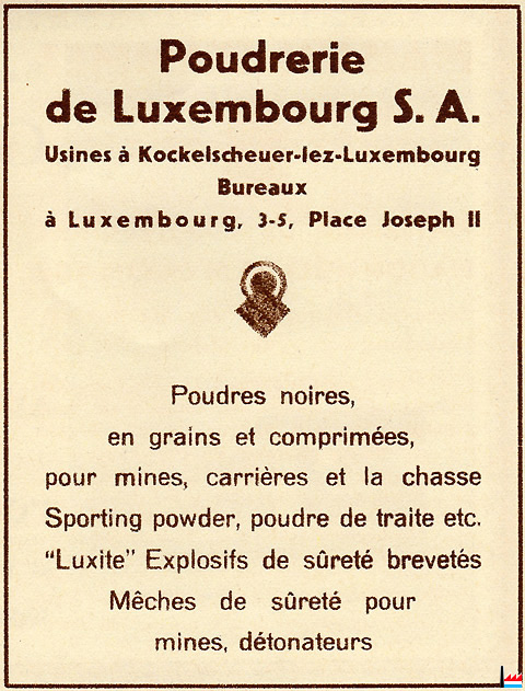 | 1935 | Explosifs Luxite (Société à responsabilité limitée) - La Poudrerie de Luxembourg S.A. et la Dynamit A.G. (anciennement Alfred Nobel et Cie) établie à Troisdorf, ont constitué une Société à responsabilité limitée au capital de 500.000 fr. représenté par deux parts sociales ayant chacune une valeur de 250.000 fr., la Explosifs Luxite qui est la transformation de l’ancienne S. A. Luxembourgeoise pour la Fabrication d’Explosifs de Sûreté; tout l'actif et tout le passif de cette société continuent à appartenir à la Société à responsabilité limitée Explosifs Luxite. (Luxembourg 15.11.1935) |