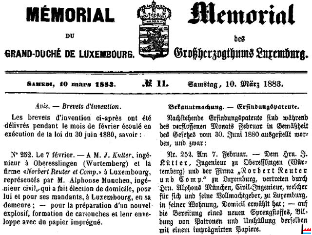| 7.2.1883 | Brevet d'invention - Erfindungspatent N° 252: A M. J. Kutter, ingénieur à Oberesslingen (Würtenberg) et la firme "Norbert Reuter et Comp." à Luxembourg, représentés par M. Alphonse Munchen, ingénieur civil, qui à fait élection de domicile, pour lui et pour ses mandants, à Luxembourg, en sa demeure; - pour la préparation d'un nouvel explosif, formation de cartouches et leur enveloppe avec du papier imprégné. (Mémorial A - N° 11 / 10.3.1883) |