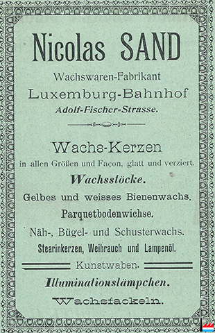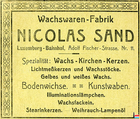 | 1910 | Nikolaus Sand, Hollerich: Fabrikation und Vertrieb von Wachswaren sowie Wachsbleichen |