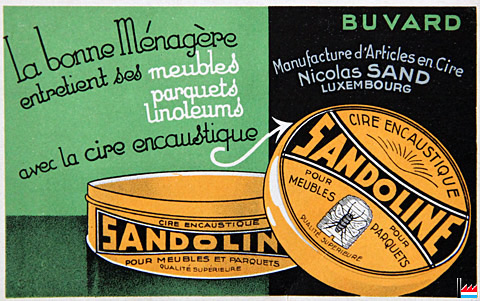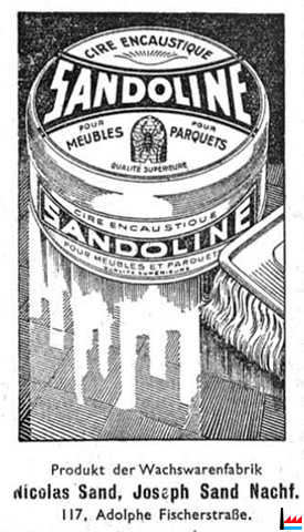 Sand, Wachswarenfabrikant zu Hollerich. Die Marke stellt im Wesentlichen das Wort «Sandalin» dar, sowie die Abbildung einer Biene. Sie wird in allen Größen und Farben und auf jede beliebige Art und Weise angewandt auf Schuhcrême, Parkettwachs, Wachskerzen, Ofenglanz, Lederfett und Wachsschnur. |