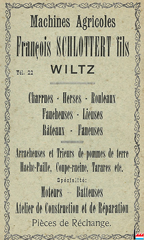 Schlottert, Niederwiltz landwirtschaftliche Maschinen und Eisenwaren Inhaber: Josef Schlottert, Niederwiltz (Inscription au registre aux firmes N° 529 - Du 3 novembre 1914) |