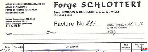 | <=1967 | ![]() Forge Schlottert - Succ. HENTGES & HOURSCHT s. e. n. c., 2, rue du Château, Wiltz, Luxembourg, Téléphone 96 382 - Atelier de construction métalliques - Atelier de tournage - Portes et fenêtres métalliques - Ferronnerie d’art. - Facture du 31.12.1967. (Collection Philippe Aschman) |