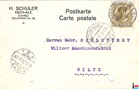 Carte postale de H. Schuler, Esch/Alzette à Gebrüder Schlottert - Wiltzer Maschinenfabrik, Wiltz - 10.2.1923 (Collection: Marcel Schlim)