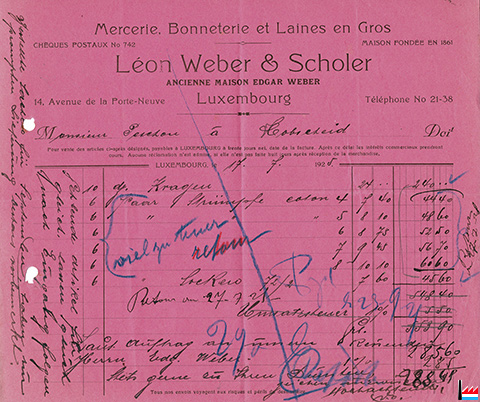 | 1917 - ? | Scholer Antoine, Texilgrossist in Luxembourg, rue Porte-Neuve | ||