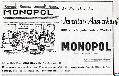 | 1938 | Eröffnung der "Filiale" in Esch nicht unter dem Namen Monopol, sondern Scholer | ||