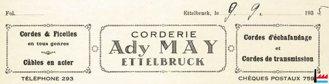 | <=1935 | ![]() Corderie Ady May, Ettelbruck - 1935 (Collection: industrie.lu) cordes & ficelles, câbles en acier, cordes d'échafaudage, cordes de transmission Tél: 293 |