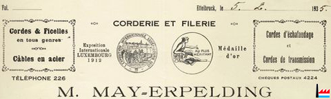 | 1914 | Michel May - Erpelding, Ettelbrück Seilerwaren Inhaberin : Anna Erpelding, Witwe Michel May, Ettelbrück (aus Echternach, + 1940) (Inscription au registre aux firmes N° 672 - Du 30 novembre 1914) |