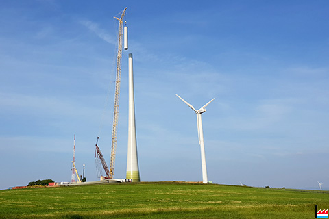 Erneuerung für Luxemburgs älteste Windkraftanlagen (1996) auf dem Pafebierg zwischen Mompach und Herborn Die 4 alten Windräder mit einer Gesamtleistung von 2 000 KW. werden durch ein einziges 193 m hohes Windrad von 6 000 KW ersetzt |